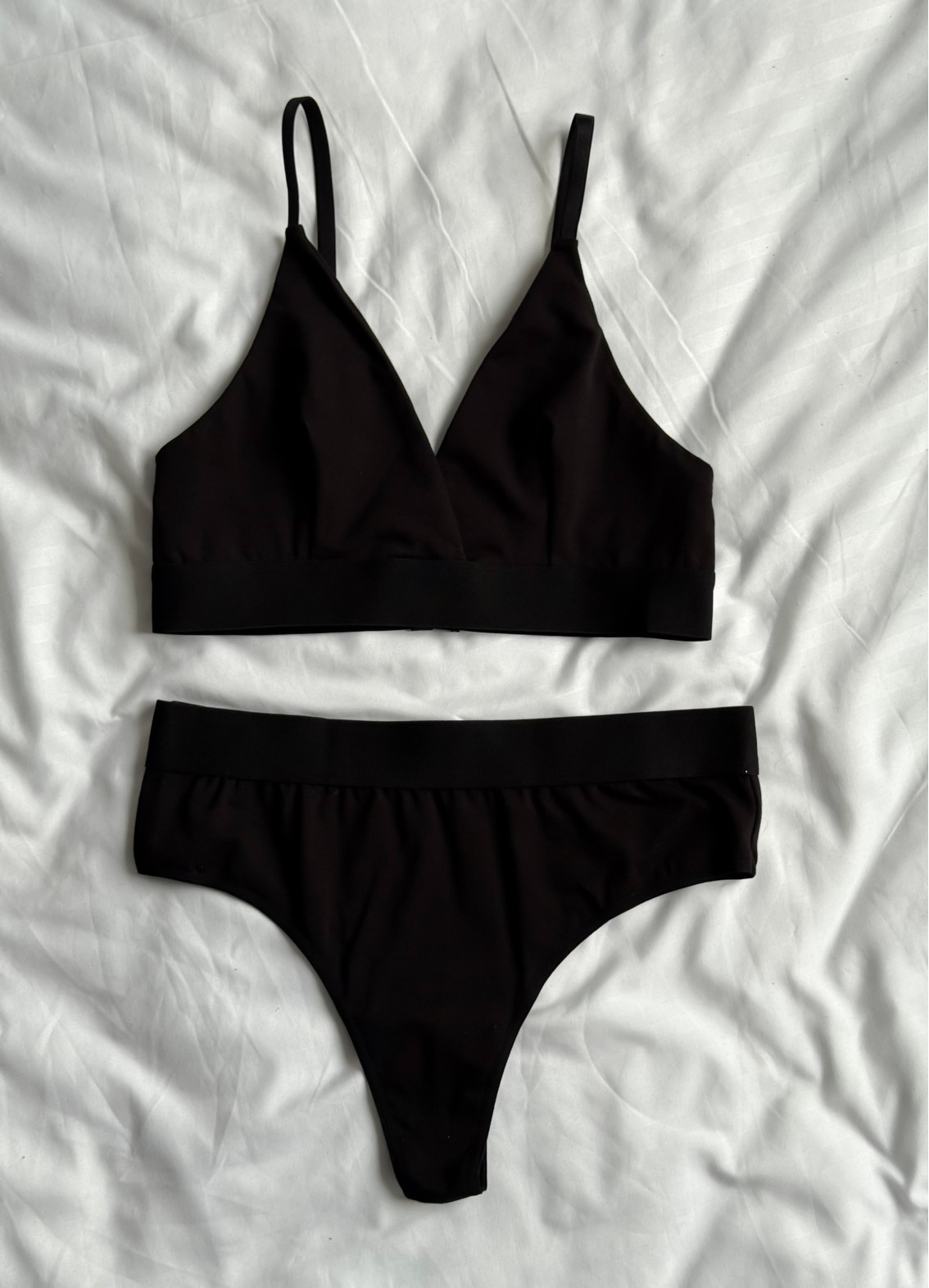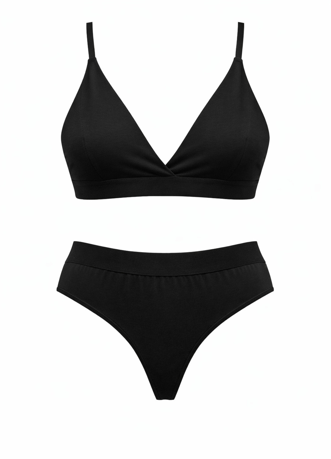 Жіночий комплект білизни, що складається з двох частин — бюстгальтера на застібці та трусиків-стрінгів. Лаконічний дизайн і зручна посадка роблять комплект практичним варіантом для щоденного носіння.
