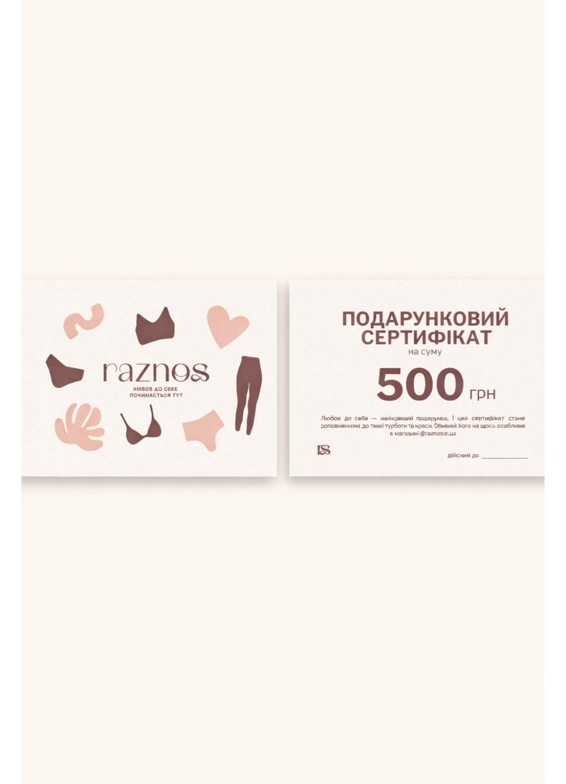 Подарунковий сертифікат RAZNOS — це зручний і продуманий спосіб зробити приємний подарунок, коли складно визначитися з моделлю, розміром або кольором. Він дає можливість обрати саме ті вироби, які найкраще підходять отримувачці.